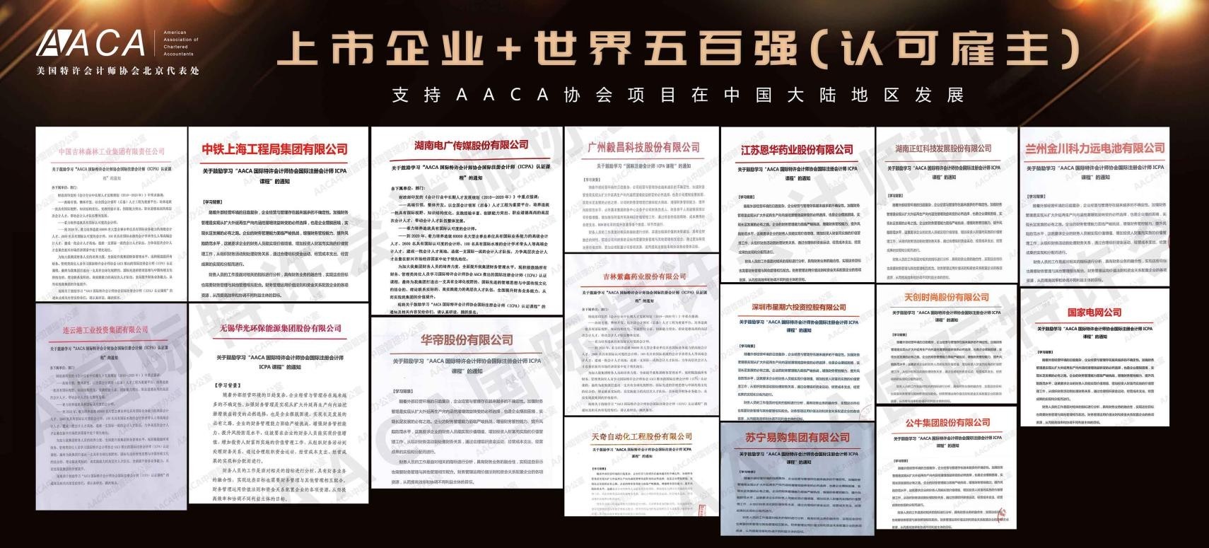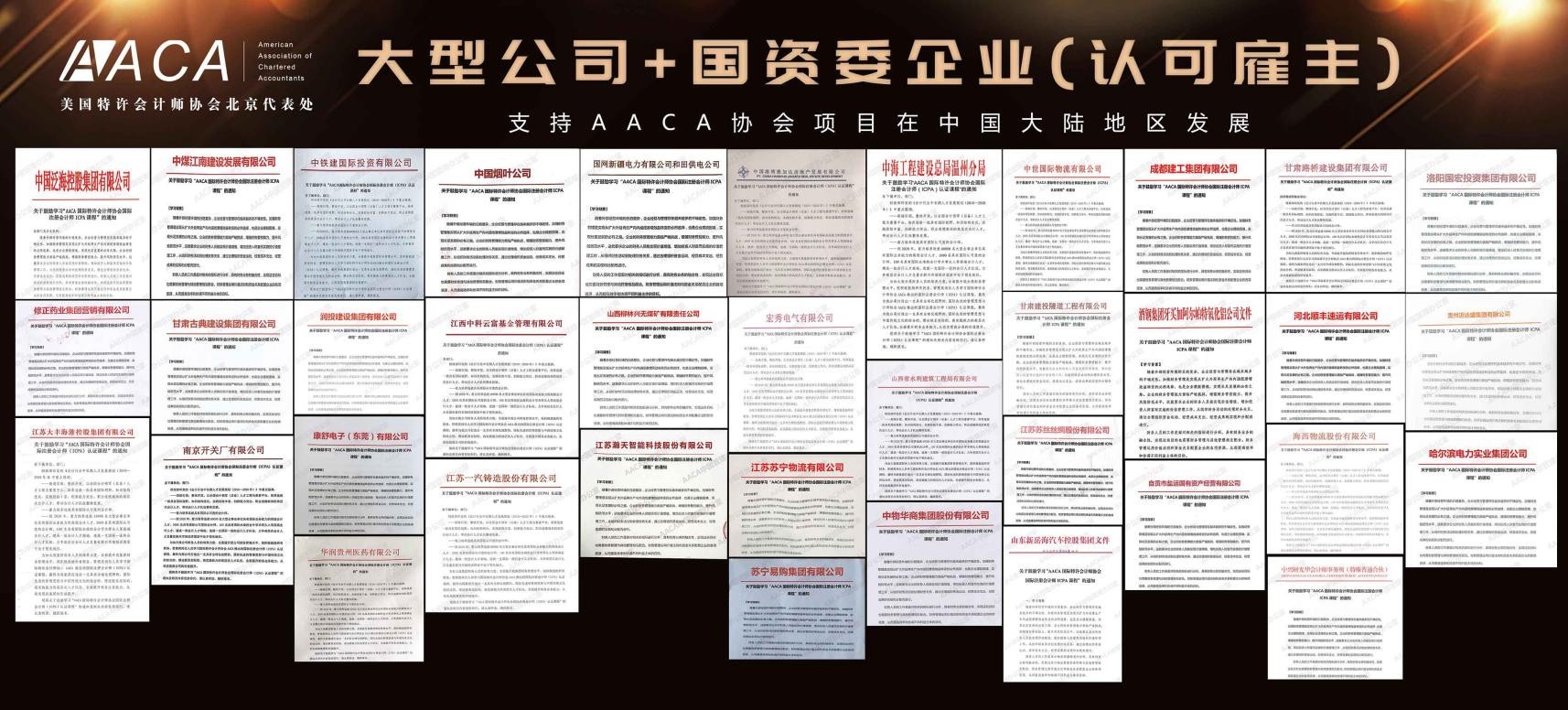 AACA国际特许会计师协会ICPA国际注册会计师证书认可计划目前已与政府及行业组织,第三方会计事务所,跨国企业,大型企业,国资类型,大型上市公司,中国500强,世界500强等诸多认可雇主开展合作,旨在帮助学员在财会行业及商界建立成功的职业生涯。通过领先的专业资格和资源,AACA国际特许会计师协会帮助企业建立卓越的财务人才梯队,提升财务团队能力,支持企业财务转型。
