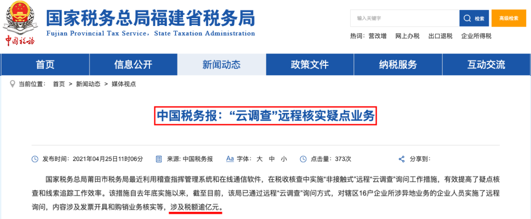 截至目前,通过远程“云调查”询问方式,已对16户企业实施了检查,内容涉及发票开具和购销业务核实等,涉及税额逾亿元!